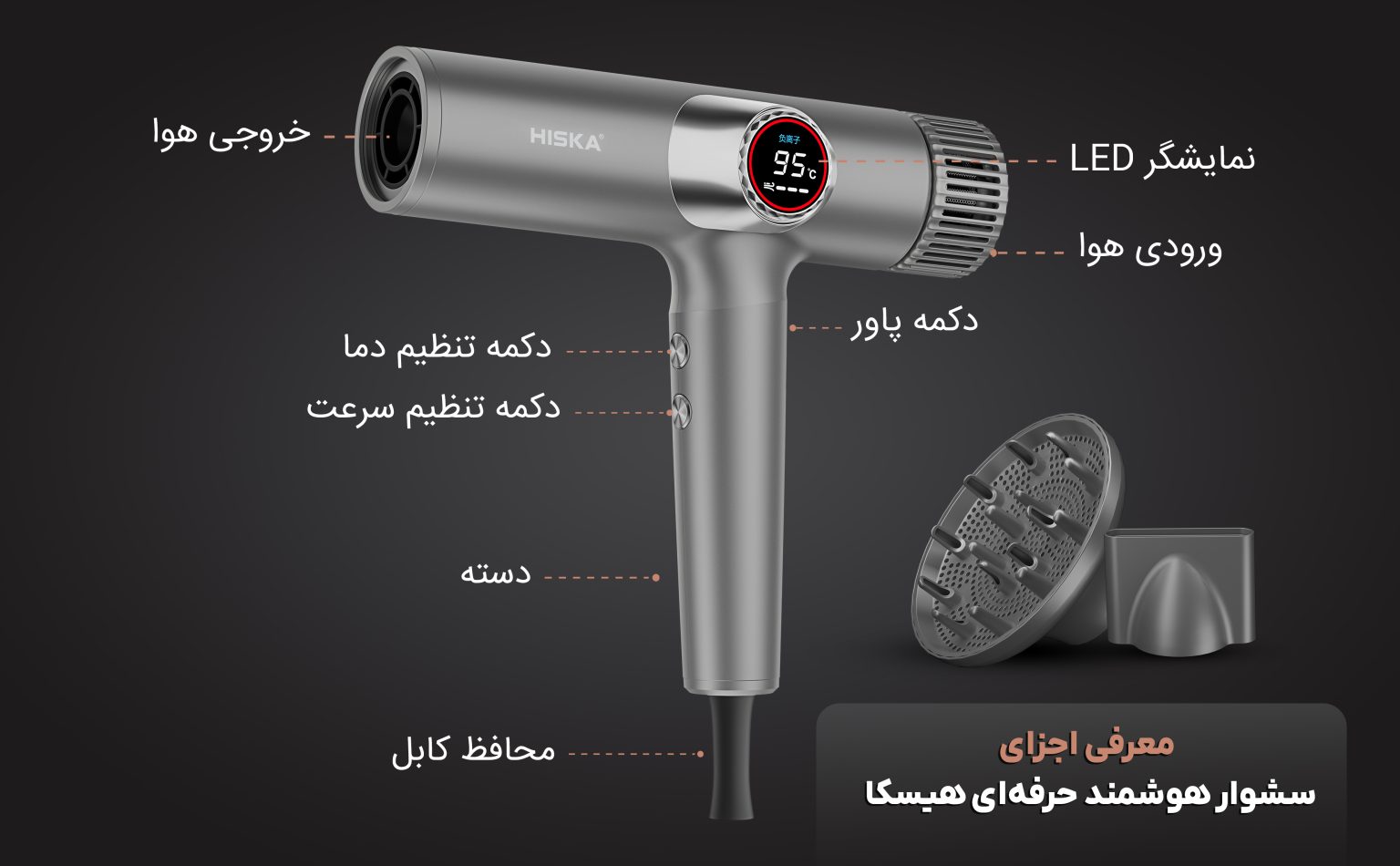 | سنسور هوشمند کنترل دما | جلوگیری از سوختگی مو و پوست سر؛ نزدیک شدن به مو باعث کاهش دما و فاصله گرفتن باعث افزایش خودکار حرارت میشود. | |