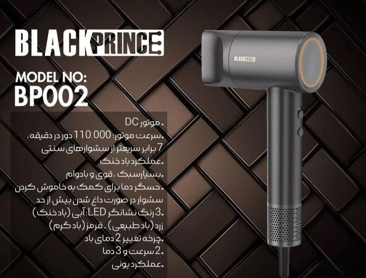 سشوار بلک پرنس BP002 با سرعت موتور بسیار بالا و بهرهگیری از فناوری یونی، انتخابی مناسب برای مصارف حرفهای و خانگی پیشرفته است. خشککردن سریع، کاهش آسیب حرارتی و تثبیت بهتر حالت مو، از مهمترین نقاط قوت این مدل محسوب میشود.