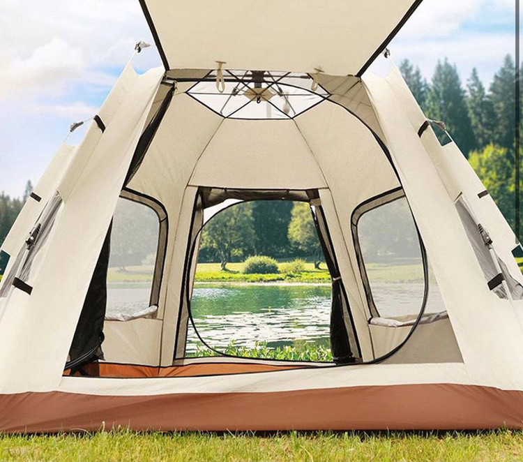 کابین ضدآب، مقاوم در برابر باد و اشعه ماوراء بنفش - طراحی ششضلعی بزرگ با ظرفیت 8-5 نفر - جنس پارچه بیرونی: آکسفورد 210D با پوشش نقرهای - جنس پارچه داخلی: آکسفورد 210D با پوشش نقرهای - جنس میلهها: فایبرگلاس 8.5 میلیمتری با سیستم فنری خودکار