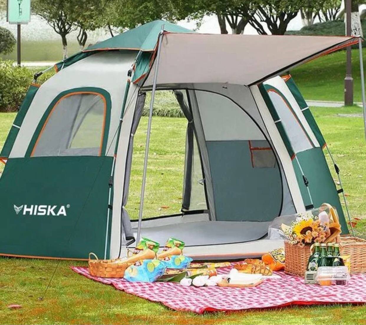 کابین ضدآب، مقاوم در برابر باد و اشعه ماوراء بنفش - طراحی ششضلعی بزرگ با ظرفیت 8-5 نفر - جنس پارچه بیرونی: آکسفورد 210D با پوشش نقرهای - جنس پارچه داخلی: آکسفورد 210D با پوشش نقرهای - جنس میلهها: فایبرگلاس 8.5 میلیمتری با سیستم فنری خودکار